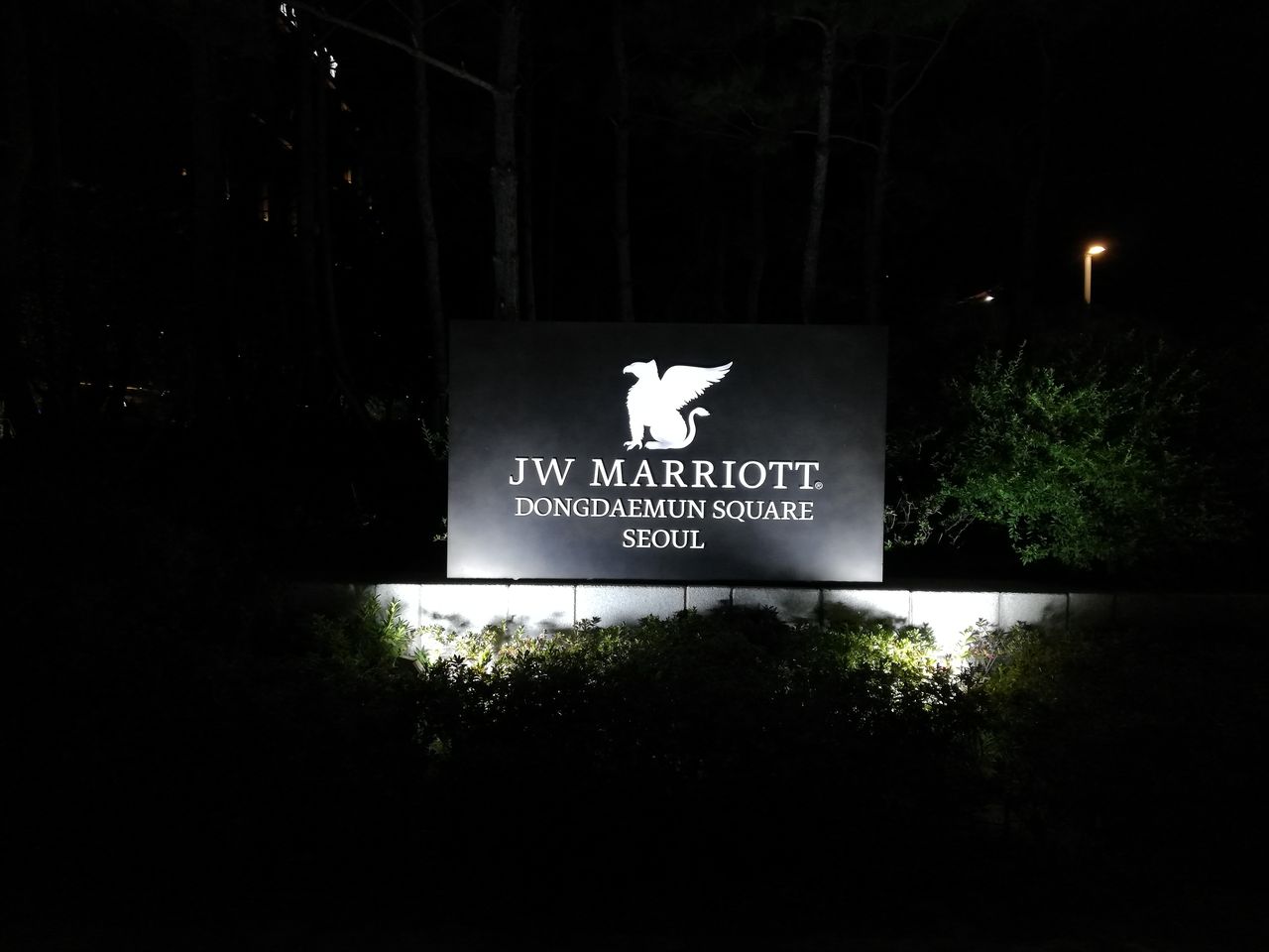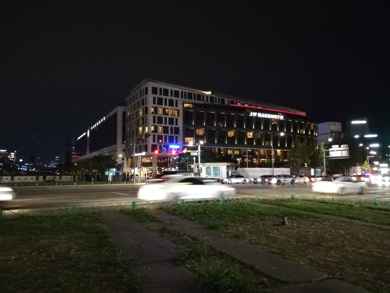 道路の反対側から見た、宿泊ホテルのJWマリオット 東大門スクウェア・ソウルです。