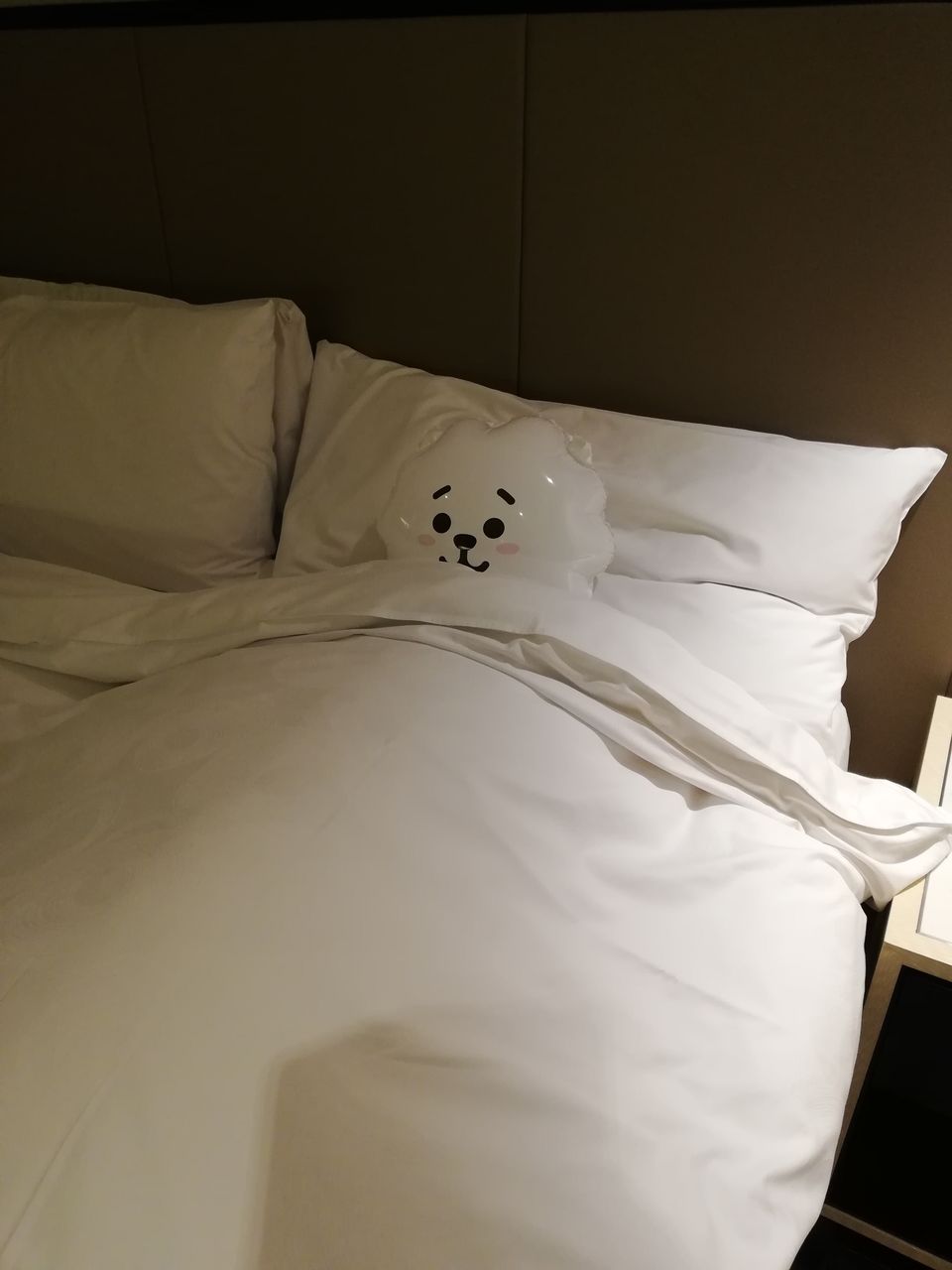 👇これはライン・フレンズ・カフェでもらったBT21の風船を、ホテルで寝ている風にしてみたものです(笑)。