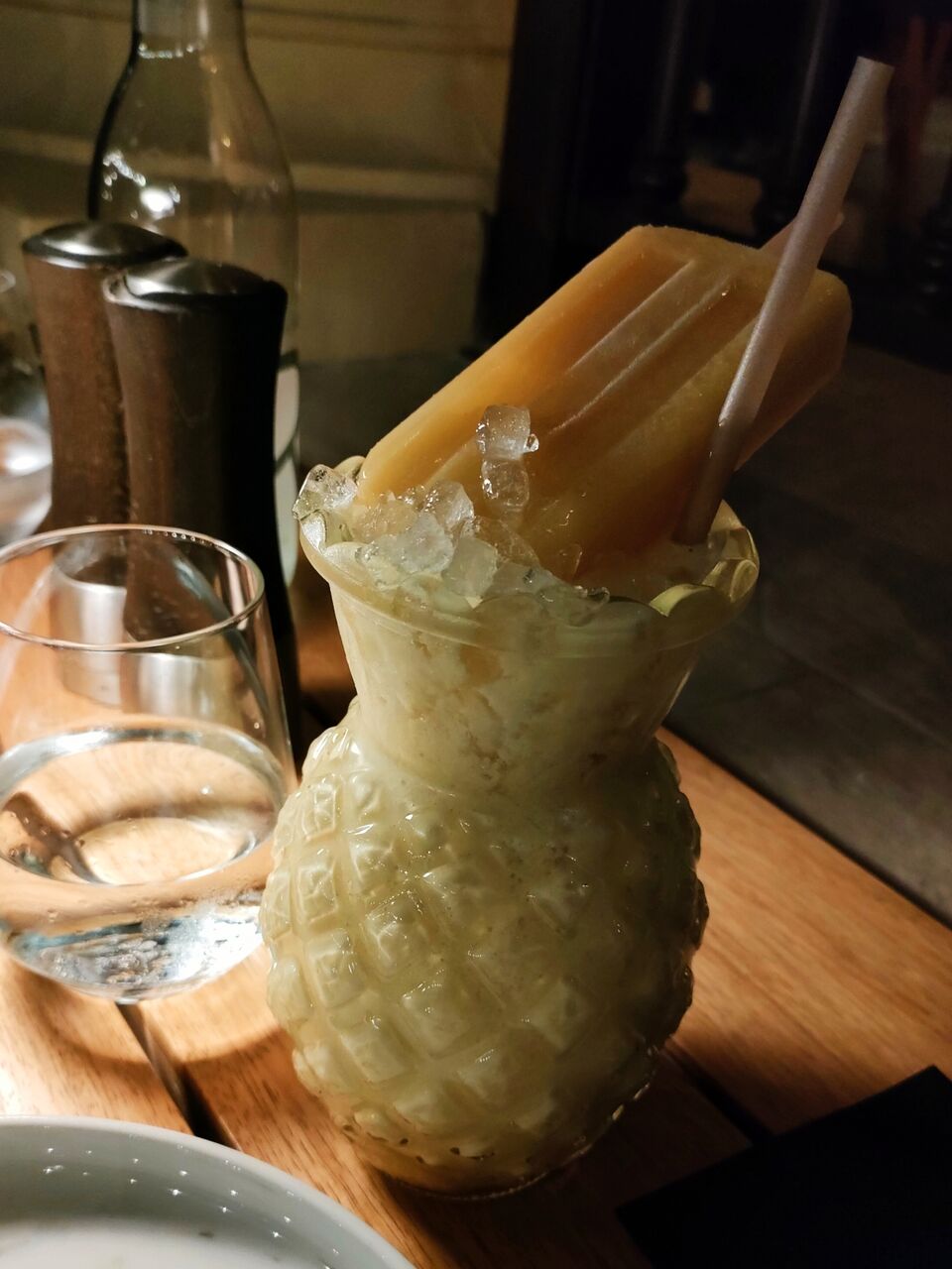 パイナップル、パッションフルーツ、ココナッツの入ったクリーミーなモクテルで、アイスキャンディーが丸ごと1本刺さっています(笑)