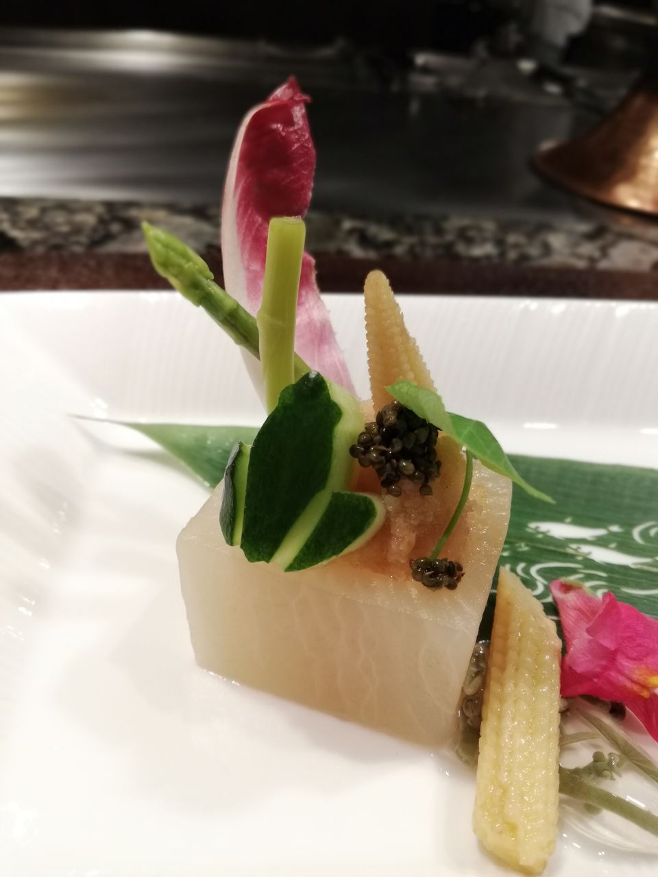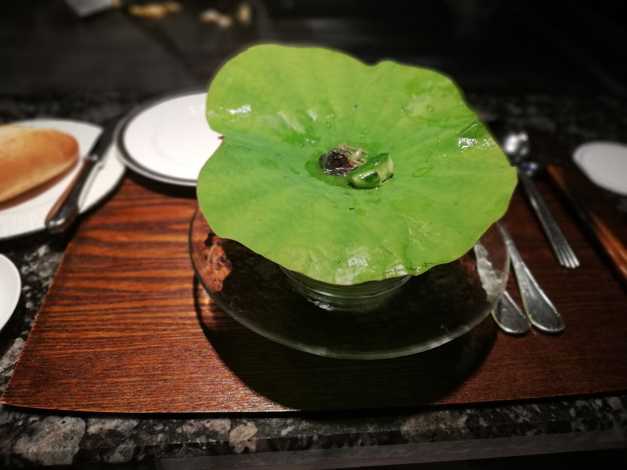 雲丹とサザエのカクテルなのですが、容器の上にハスの葉が乗っていて……