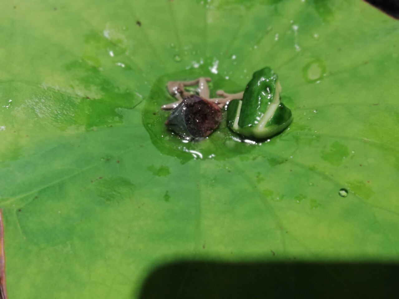 ハスの葉の上のカエルさんたちも中に流し込んで一緒に食べます。